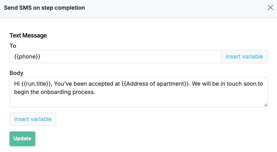 Configure a workflow step to automatically send an SMS message when it's completed.